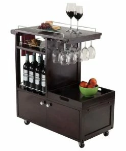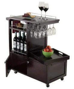Galen Cart with Metal accent is full of function for your entertaining. Comes with Serving Tray, Glass Rack, Wine Rack and storage. Perfect for your living room, game room or play room. Stylish and modern look. Cart top serving surface is 24″W x 14.89″D. Removable Serving Tray has inside area of 14.96″W x 13.62″D x 1.46″H. Shelf on the left is adjustable with size of 13.78″W x 9.13″H. Cabinet has wood door and opens to 28.23″W x 14.73″D x 9.21″H for storage. Overall assembled size of 34.25″W x 16.77″D x 34.37″H. Construction with combination of solid and composite wood in espresso finish. Assembly Required.Features