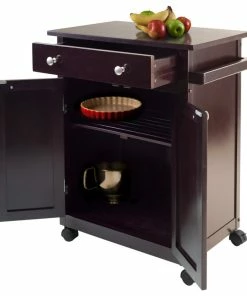 Savannah Kitchen cart has one large drawer, double doors opens to a cabinet with one fix slated shelf and bottom shelf for storage also include a handle. Accent with metal knobs. Perfect extra working space in your kitchen. Drawer inside dimension is 19.29″W x 13.31″D x 3.23″H. Slated middle shelf is 22.52″W x 12.91″D. Kitchen Cart Top is 25.98W x 17.32″D. Easy to move around with four casters. Cart is made with combination of solid and composite wood. Assembly Required.Features