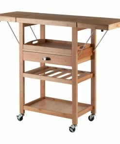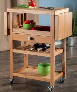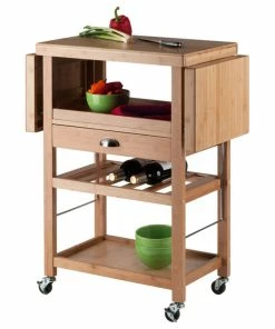 Everything you need to expand your kitchen, dining, or entertaining workspace is here in the Barton Kitchen Cart. Made of eco-friendly bamboo, this versatile space-saver has a wide range of uses. Two drop leaves expand the table top to create a large surface for chopping vegetables, tossing a salad, or for use as a serving area. Store wine bottles on the built-in wine rack and use the other shelves for glassware, dishes, and more. A unit-wide drawer and a removable serving tray complete this indispensable addition to your home. The Barton Cart features drop leaves on both sides that are held open with sliding chrome metal rods. A removable serving tray with cut-out handles fits snugly on the upper shelf. The middle shelf with slats can be used for additional storage or to hold up to 5 bottles of wine. The cart rolls easily and has two wheels with locking casters. The drawer is finished with a brushed metal handle. Made of bamboo in a natural finish. Overall size is 27.1″W (with leaves down) x 14.8.1″D x 35.4″H. Assembly required. Overall dimensions (with open leaves) 45.2″W x 14.8.1″D x 35.4″HTop dimensions (leaves down) 23.6″W x 14.8″DIndividual leaf dimensions 10.8″W x 14.8″D Top shelf 19″W x 13.3″D x 9″HMiddle slatted shelf 19″W x 11.9″D x 5.3″HBottom shelf 19″W x 11.9″D x 10.2″H Inside drawer dimension 18.1″W x 12.2″D x 2.6″HShips in 1 boxFeatures